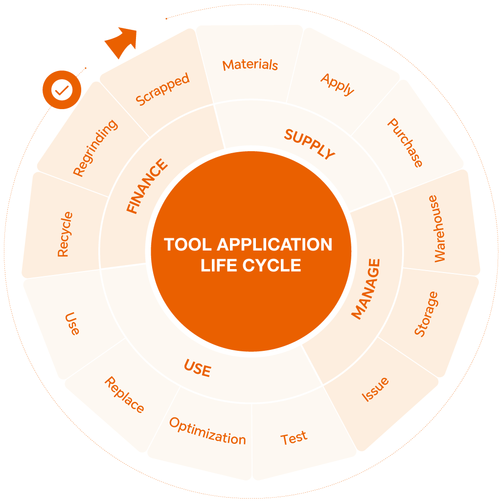 Tool Recycling: We offer a dual-path [Scrap + Regrind] recycling solution. Operators make the first judgment upon return, warehouse staff perform a second review, and the system confirms the final status. This layered validation ensures every tool is handled correctly and guarantees the accuracy and traceability of return/recovery data — ending the “uncertainty” of tool management.
